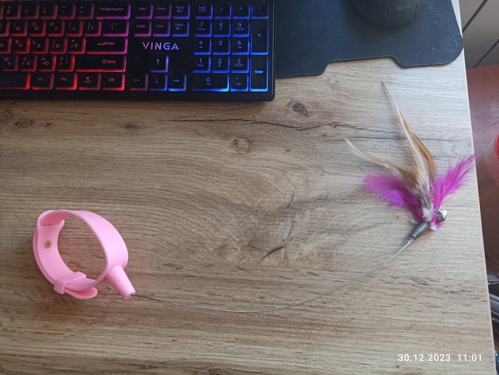 Good day everyone 🤗🌹. Cat toy 🐈⬛😸. Can be attached to the owner’s leg or to the animal’s neck. In both cases the toy is not bad. There is a bell near the feathers. I wish you all successful shopping 🛍 and all the best ⚘️⚘️⚘️.