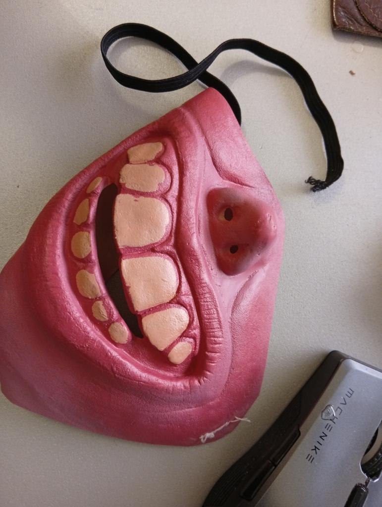 The color of the mask leaves much to be desired. It's a very bright, saturated, almost cherry color, far from the color of the face. The elastic band is sewn halfway off and very carelessly.