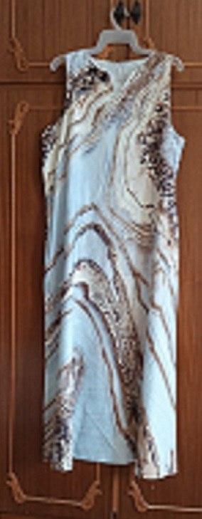 Cute beach dress. Artificial silk. Wore it to the sea - okay. Sewn neatly. No complaints. Took size 50 XL.
