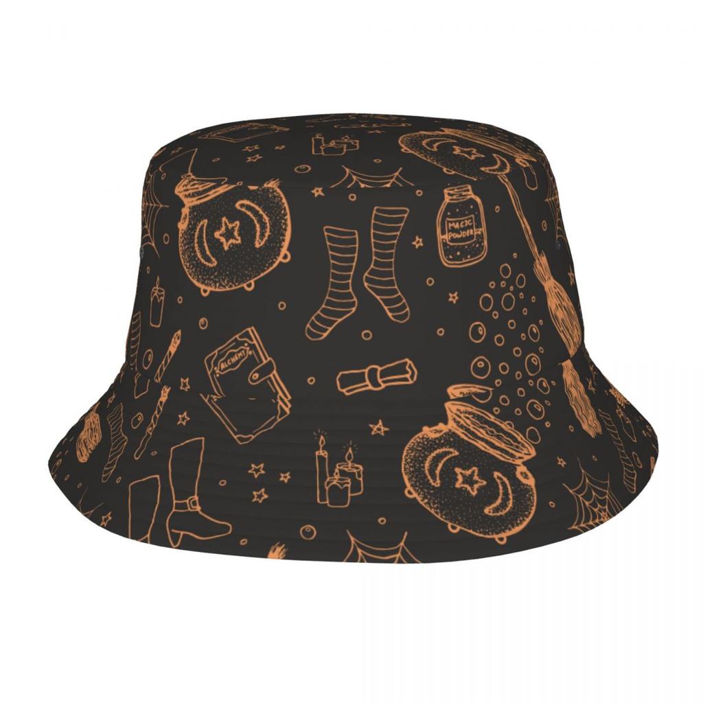 Unisex Bucket Hat Halloween Pattern Pumpkin Witch's Broom Hat Vocation Getaway Headwear Outdoor Fishing Cap Ispoti Hat Gift