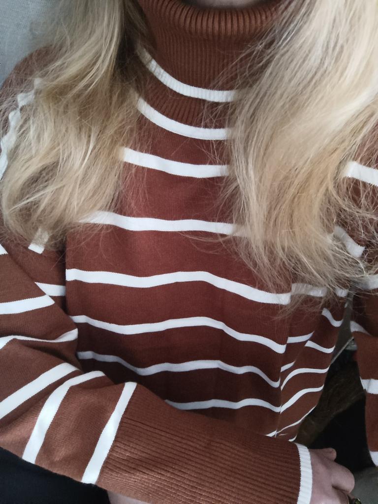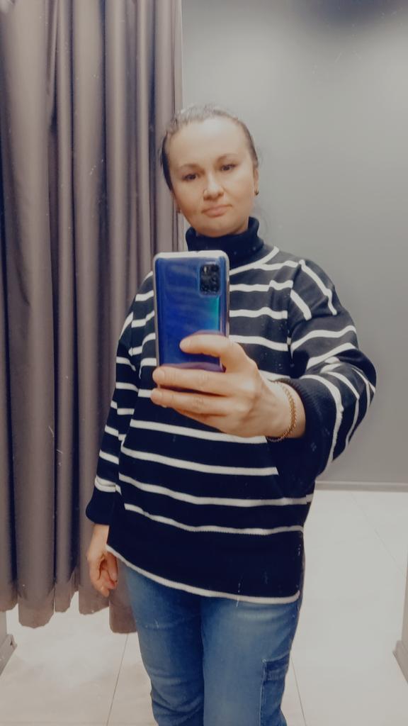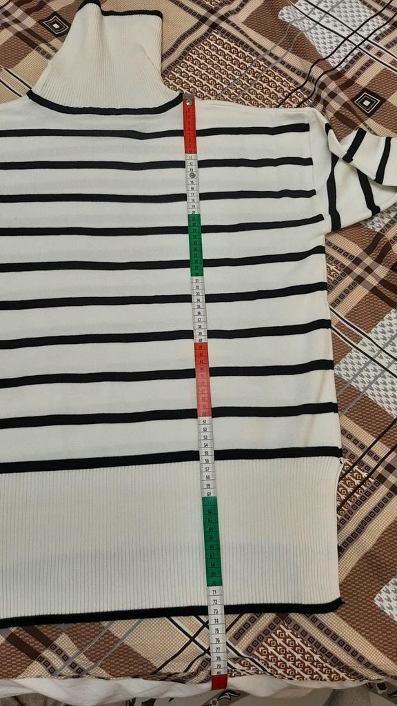 Very good jumper, soft and cozy. The back is a little longer than the front. Just right for size 46-48. I recommend.