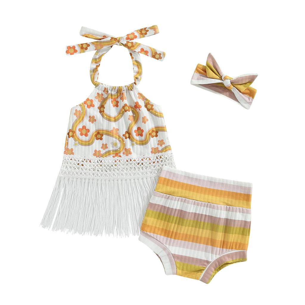 Baby Girl Summer Outfit Flower Print Tassel Hem Tie-Up Halter Neck Sleeveless Tank Tops Stripe Shorts Headband 3Pcs Clothes Set