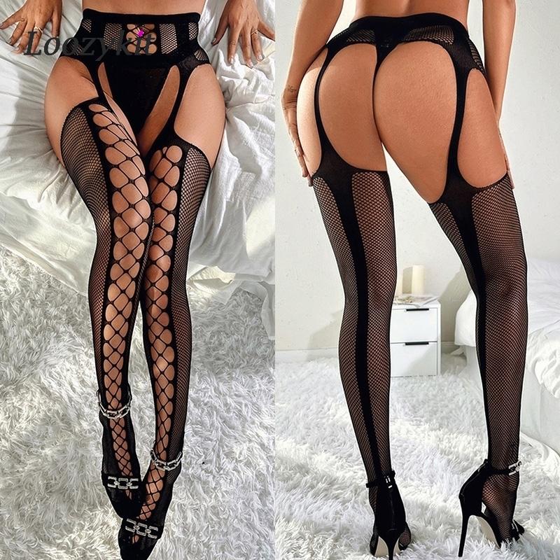 Sexy Fishnet Stockings For Sex Mesh Transparent Underwear Women's Nylon Thigh High Stockings With Garters Open Crotch