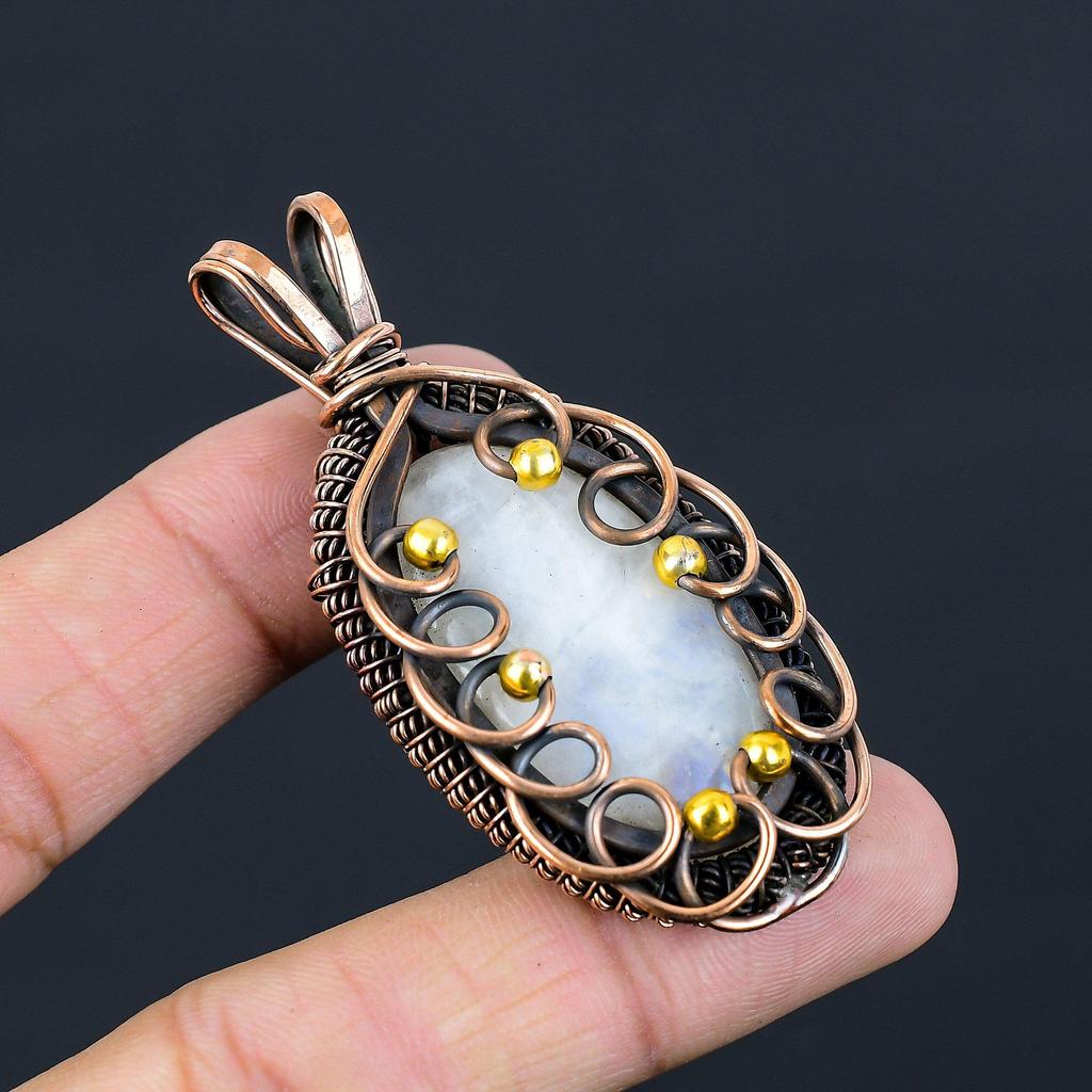 Rainbow Moonstone Gemstone Pure Copper Wire Wrapped Handmade Jewelry Pendant