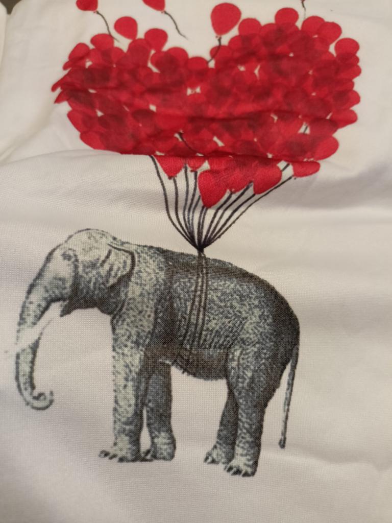 The size runs very small. The print is as pictured. It will suit skinny girls with small breasts better. Otherwise, this heart spreads out visually.