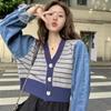 Small Design and Patchwork Denim Sweater Cardigan Autumn Women's Short Contrasting Striped Knit Top Trend