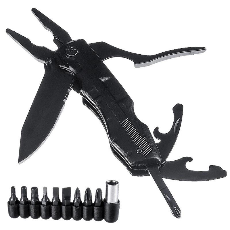 The multi-tool set includes: sharp knife, pliers, pliers, tongs, wire cutters, bit set, can opener, opener.