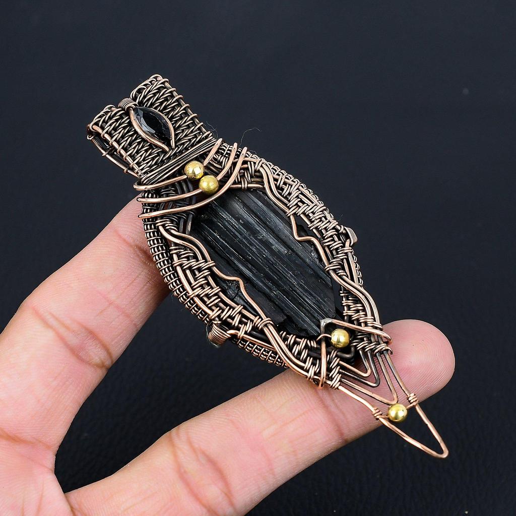 Black Tourmaline Gemstone Pure Copper Wire Wrapped Handmade Pendant Jewelry Gift