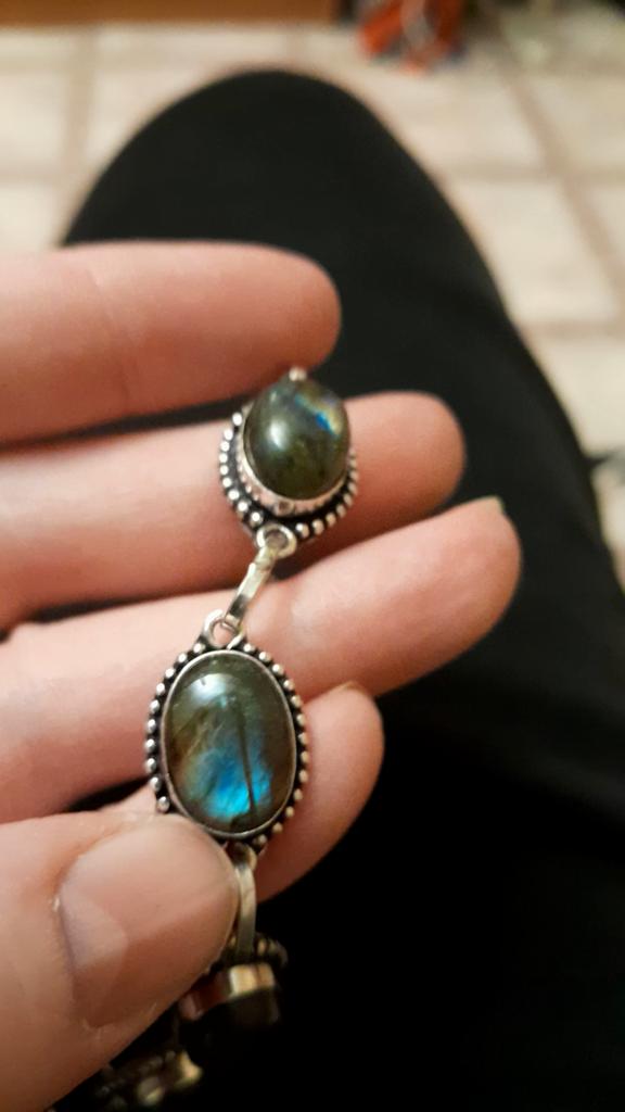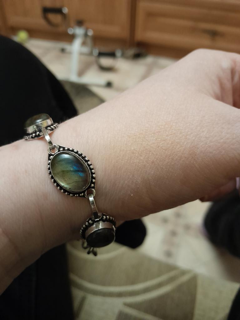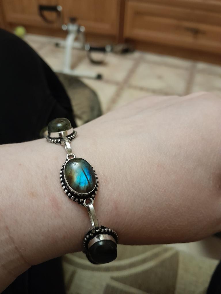The bracelet is handmade. The metal is not processed in the best way, the soldering of the connecting elements is sloppy. This would be fine, it can be attributed to manual work. But one of the most beautiful stones is inserted into the frame with a large distortion. It is tightly rolled, it is impossible to straighten it. The stones are amazing, with pronounced iridescence. Cast in yellow, green, blue. They deserve a reverent attitude from the master and better quality framing.