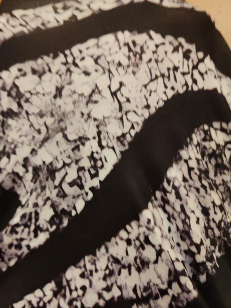 The quality is good, nice silky fabric. The print is white, not silver. It's a shame, but you can wear it. I recommend it.