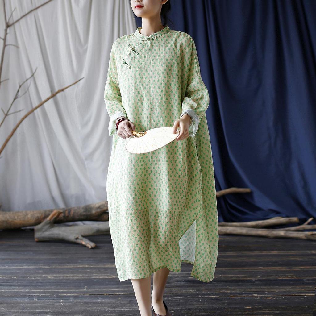 Johnature Women Green Ramie Chinese Style Dress Stand Long Sleeve Print Floral A-Line Dress Autumn Button Vintage Dress
