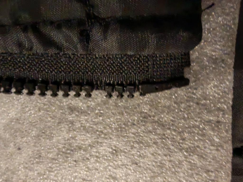 The front placket of the coat is cut. There is 1 holder missing on the drawstring. The zipper for the lining is damaged.