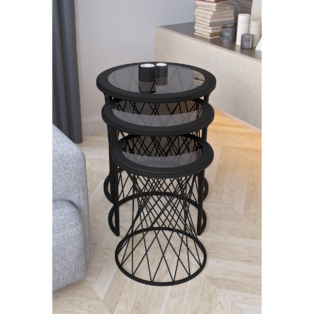 Wicker 3-seat Nesting Coffee Table Black Legs Smoked Glass MDF