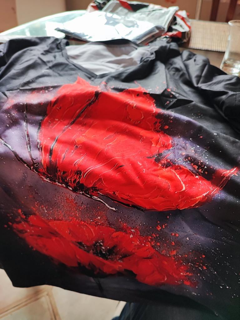 Pure black T-shirt and red design. No grey at all. Too bad