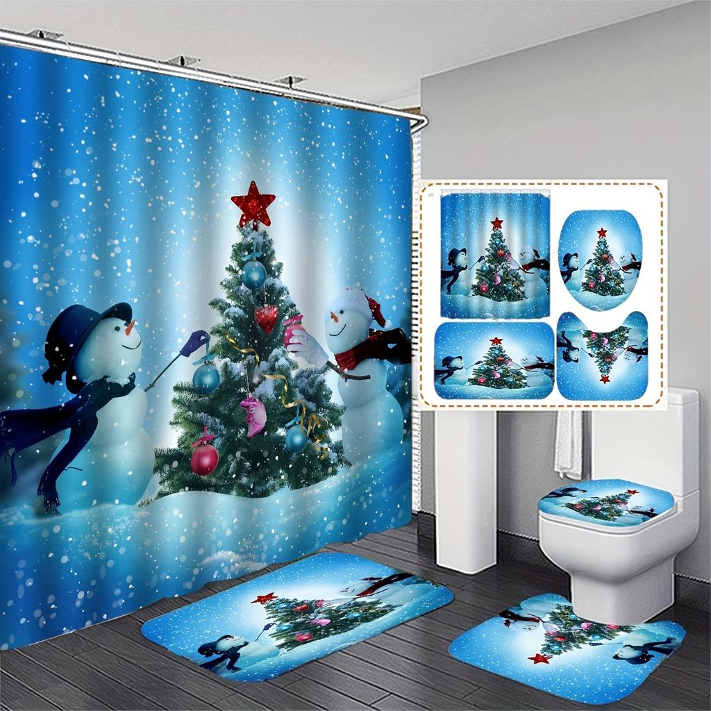 4Pcs Merry Christmas Shower Curtain Sets for Bathroom Non-Slip Bathroom Rugs Lid Toilet Cover Bath Mat Bathroom Set