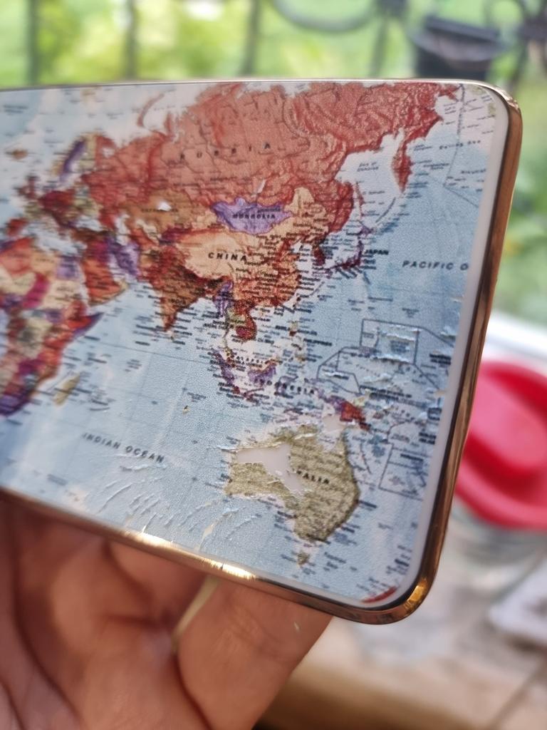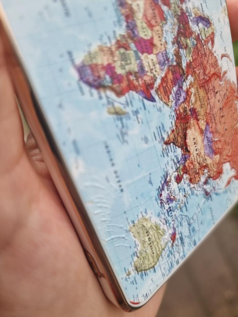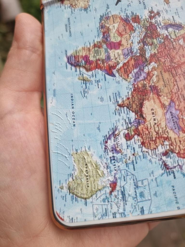 A regular cute case with a map print, after 3 months of use (I bought it for my mother) the gold frame in the charging area and the volume and power buttons has worn off, the map pattern has also peeled off, but if it all peels off, it will just be a turquoise glossy case, so it’s not fatal, it’s good for playing around. It’s been half a year, it’s all peeled off..