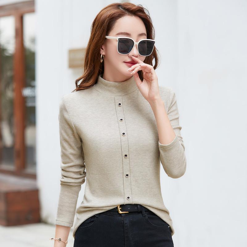 Spring and Autumn Women's Blouse Slim Button Solid Color Long Sleeve Half High Neck Bottom Shirt Tunic