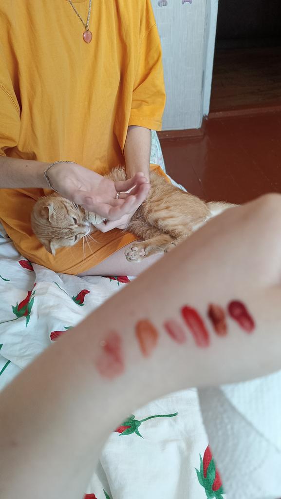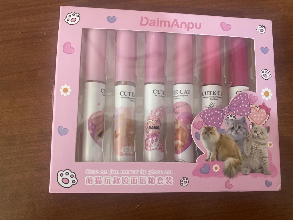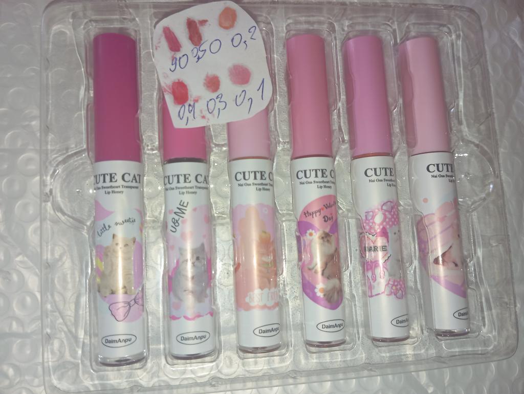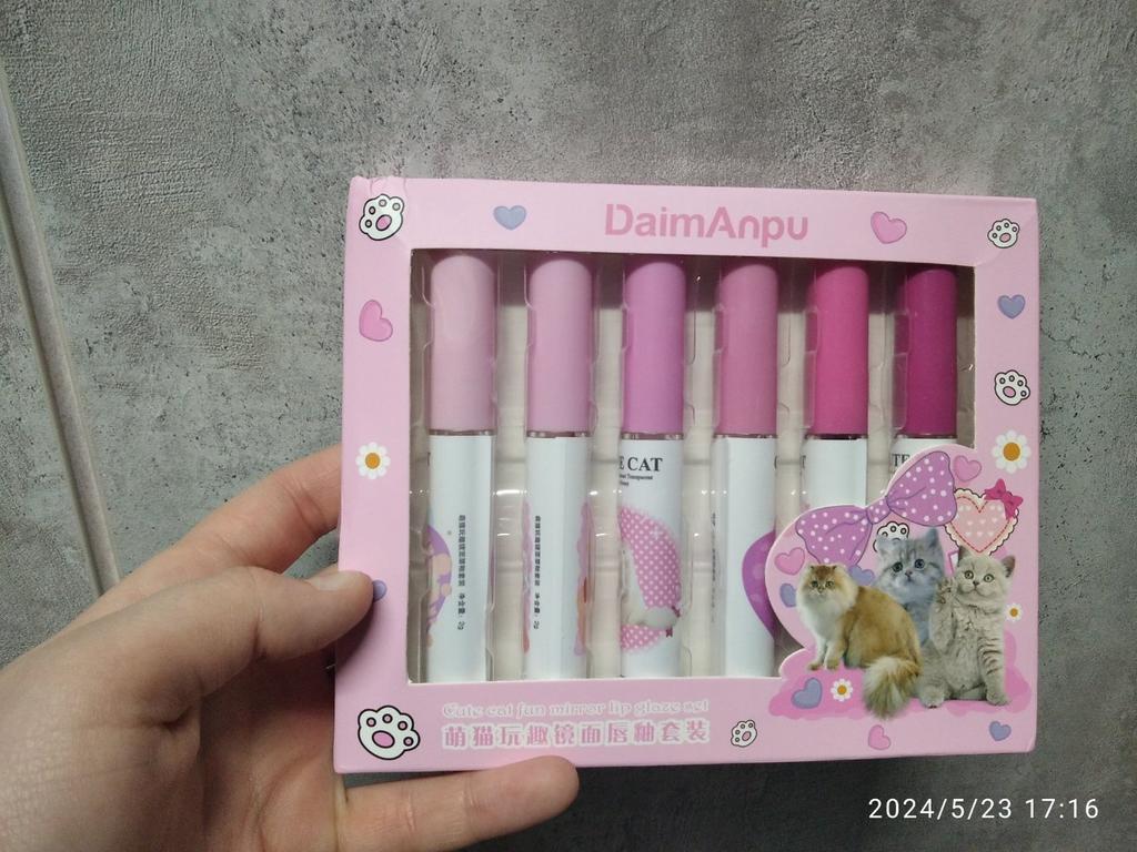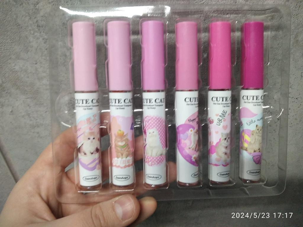 Review of the set of six lip glosses! Advantages: 1. The quality of the vials is better than I expected. 2. Cute print. 3. Low price. Of the shortcomings: 1. Too bright shades, making them look childish. 2. Liquid texture. 3. It's difficult to apply evenly on the lips. 4. Packaging defect (does not affect the product rating). 5. Play-Doh smell. Next, a subjective opinion: it feels unpleasant on the lips. The brush also causes not the best sensation. After application, itching appears, possibly an allergic reaction. Glad if my review was helpful, I will be grateful for a like and a subscription ❤️.