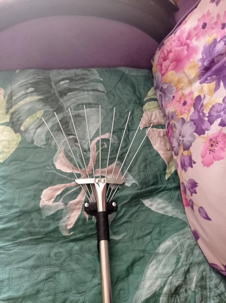 Versatile tool for clearing leaves, sweeping roofs, and loosening soil in flower beds.