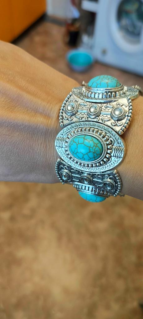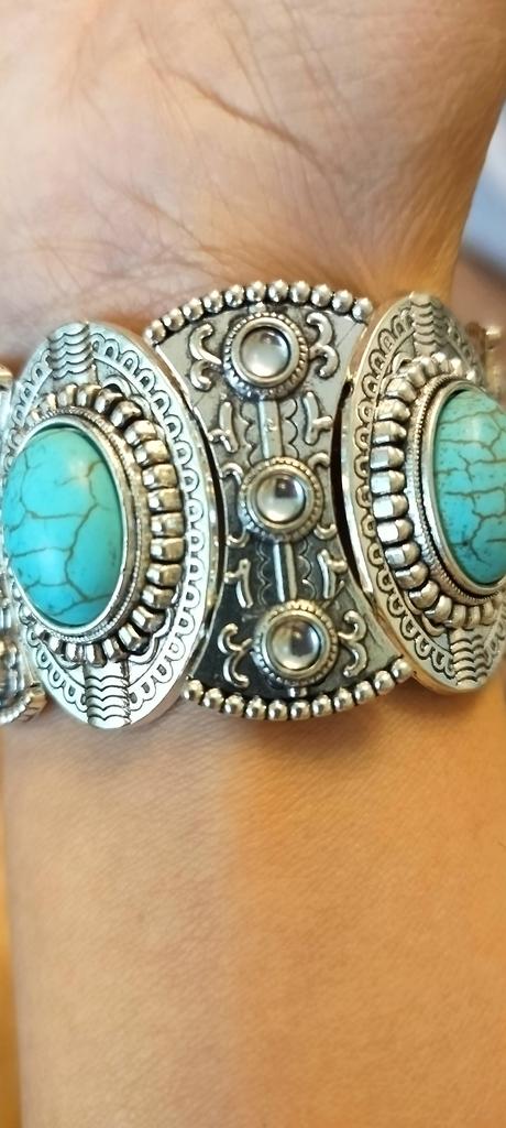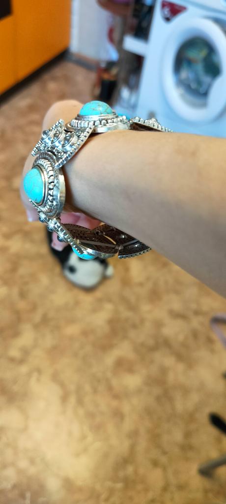 Doesn't match the picture. There is no blackening and therefore the metal of the bracelet looks cheap. The imitation of turquoise is bad. Looks cheap. Threw it away.