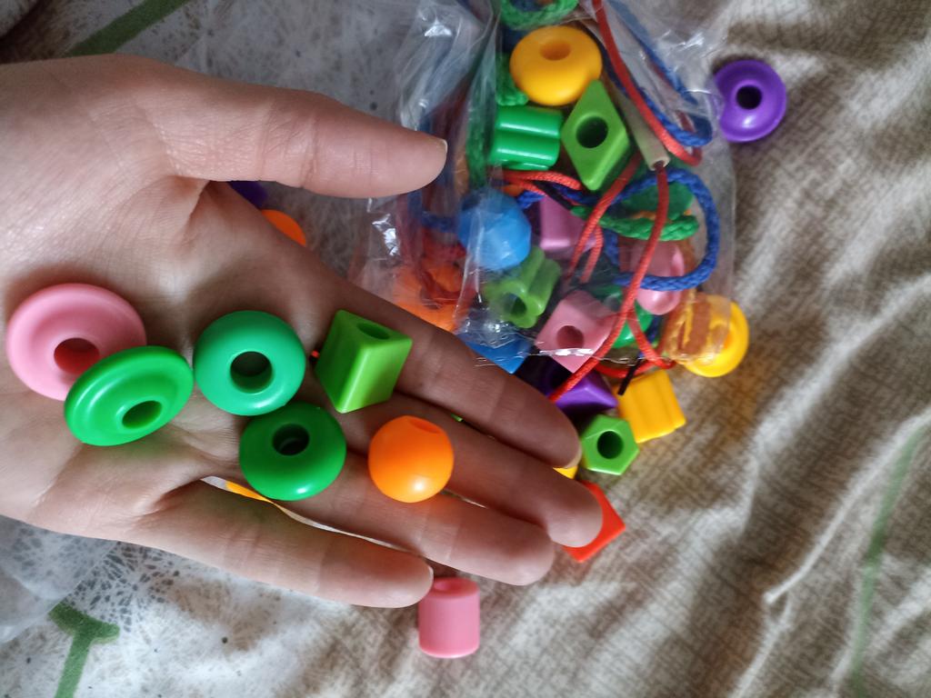 Large beads, just what the child needs, although the cords are thin and the tips are not like in the picture, but they are easy to string and the beads are bright.