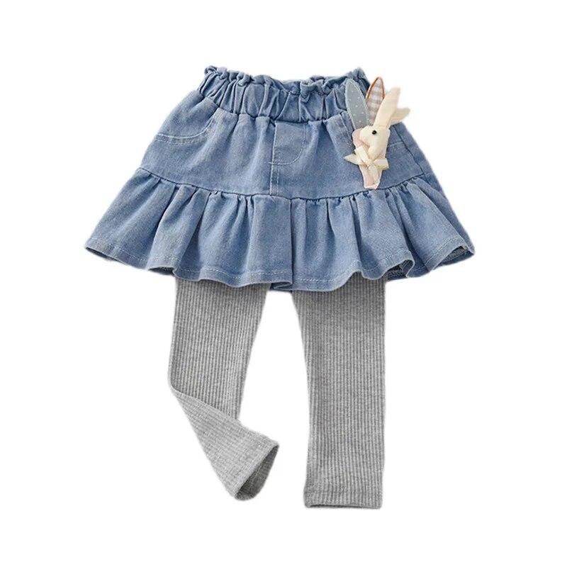 Girls Fake Two Skirts Pants Spring Autumn Children Casual Leggings Baby Kids Rabbit Cartoon Denim Skirt With Knitted Trousers