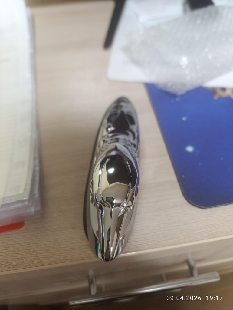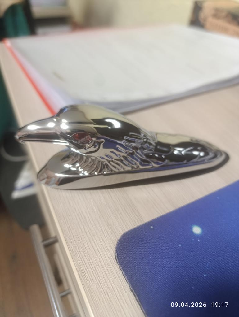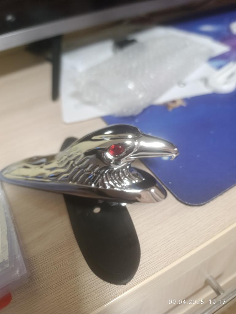 The eagle is made of some shiny alloy. Shiny, heavy. The kit includes a rubber pad, two studs and two nuts for fastening.