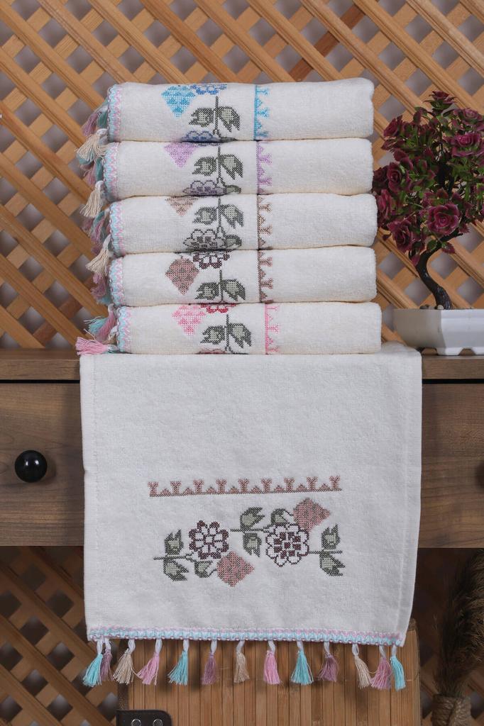 Set of 6 Cross Stitched Flower Embroidered Hand and Face Towel Set with Tassels, Gift Dowry Hand and Face Towel Set 50 X 90 Cm