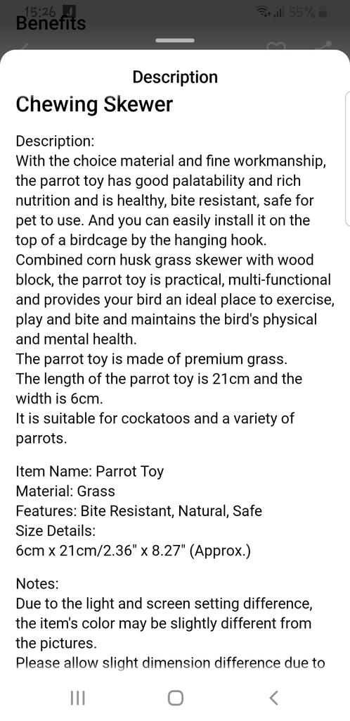 This is the second chew toy I've bought, the parrot tore the first one all to shreds, so I bought a new one..