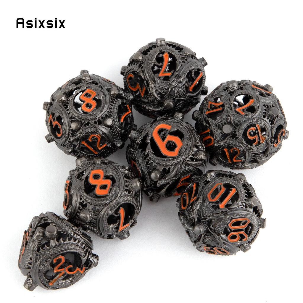 7 Pcs Black Orange Circular Dragon Metal Dice Hollow Metal Polyhedral Dice Suitable for Role-Playing RPG Board Game Card Game