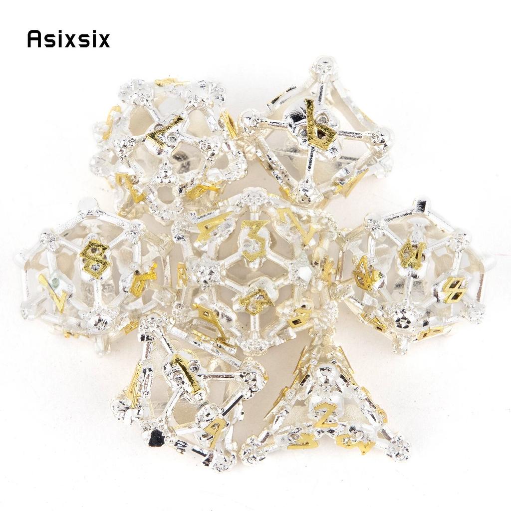 7 Pcs White Golden Skull Head Metal Dice Hollow Metal Polyhedral Dice Set Suitable for Role-Playing RPG Board Game Card Game