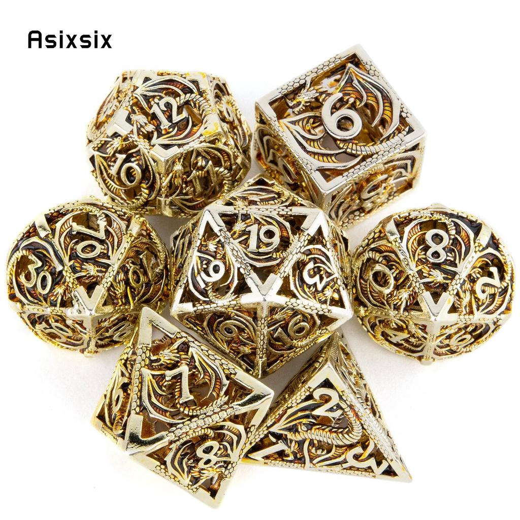 7 Pcs Light Golden Dragon Metal Dice Dragon Hollow Metal Polyhedral Dice Set Suitable for Role-Playing RPG Board Game Card Game