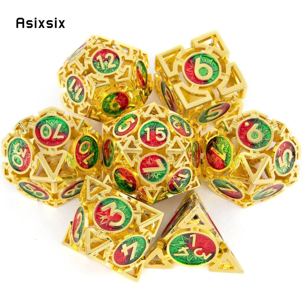 7 Pcs Golden Red Green Metal Dice Circular Hollow Metal Polyhedral Dice Set Suitable for Role-Playing RPG Board Game Card Game