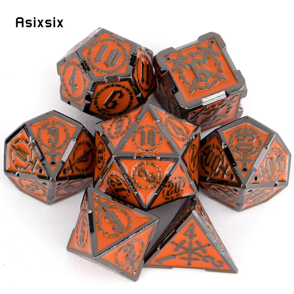 7 Pcs Orange Silver Double Swords Metal Dice Solid Polyhedral Dice Set Suitable for Role-Playing RPG Board Game