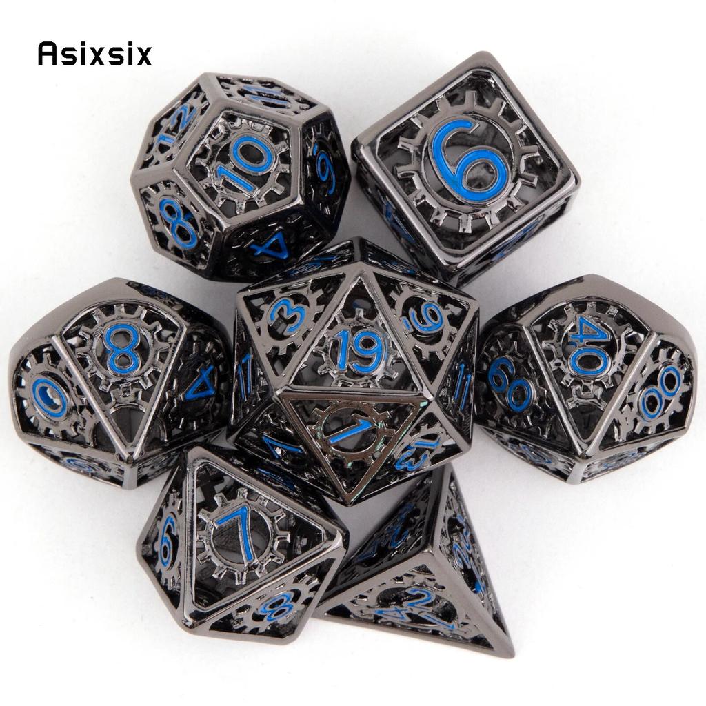 7 Pcs Black Blue Gear Wheel Metal Dice Hollow Metal Polyhedral Dice Set Suitable for Role-Playing RPG Board Game Card Game