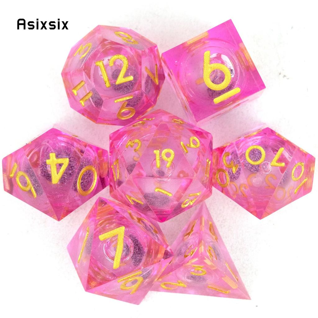 7 Pcs Pink Golden Number Flowing Sand Sharp Edge Dice Polyhedral Dice Suitable for RPG Board Game
