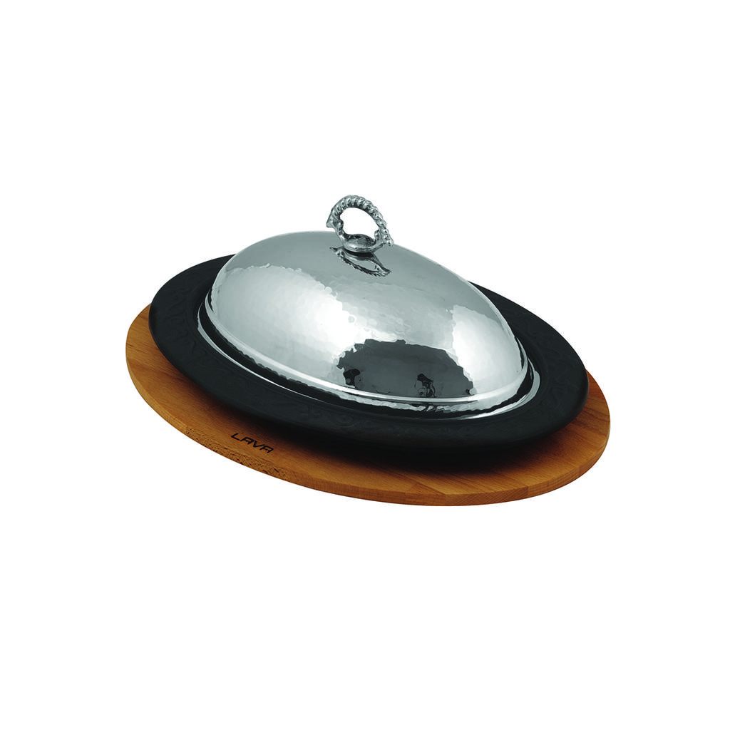 Lava Cast Iron Oval Serving Plates And Bowls. With Wooden Platter 32X23cm.