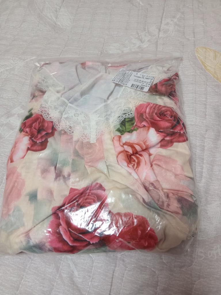 Women's Home Wear Pajama Set - V-neck Lace Patchwork Printed Short-sleeved Long Dress Pajama Set