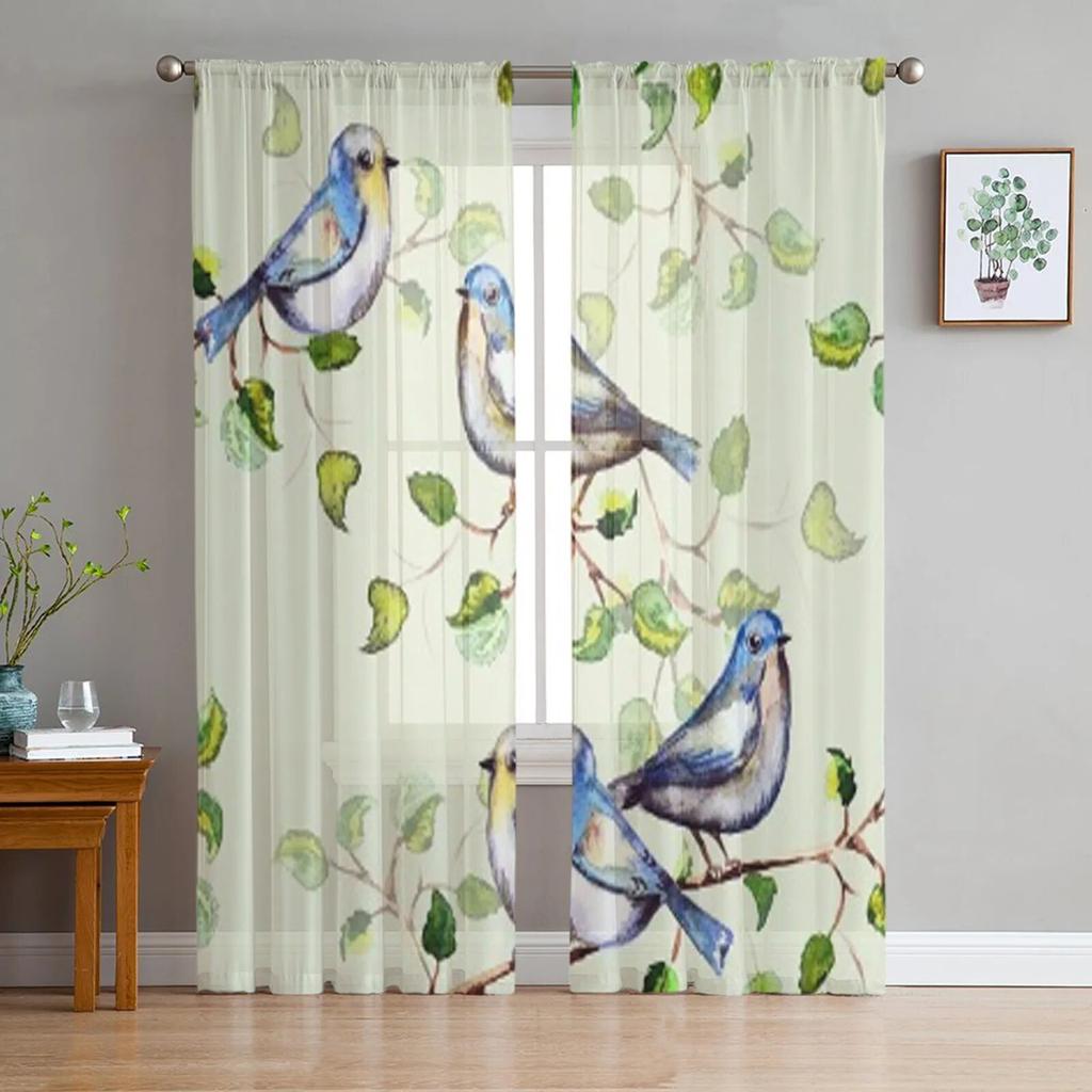 Watercolor Leaves and Birds Window Curtains Sheer Chiffon Tulle Curtain Home Living Room Backdrop Decoration