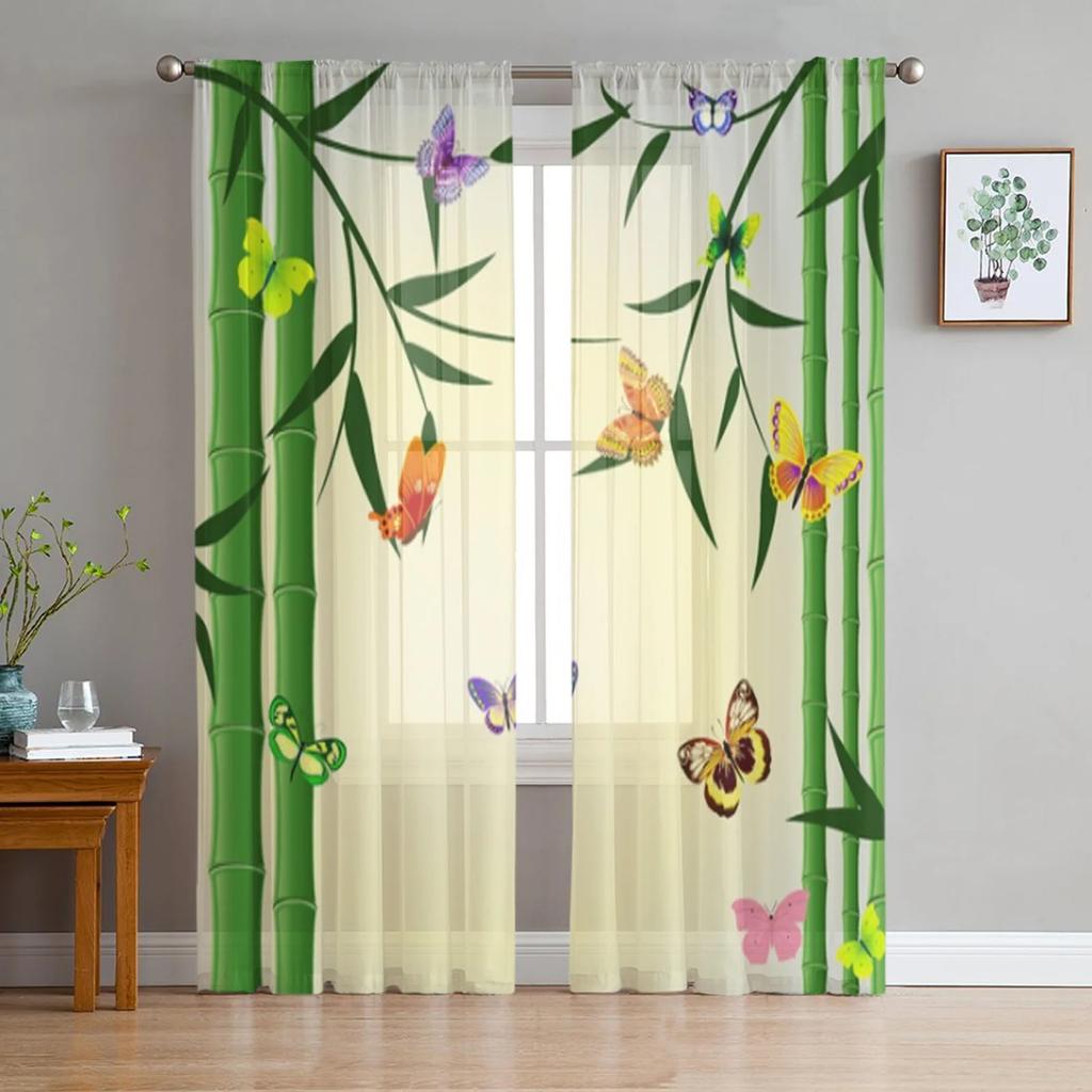Bamboo Pattern With Butterflies Tulle Sheer Window Curtains For Living Room Bedroom Modern Chiffon Voile Curtains Fabric Drapes