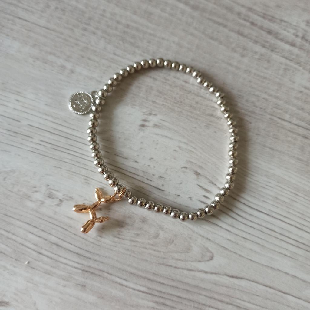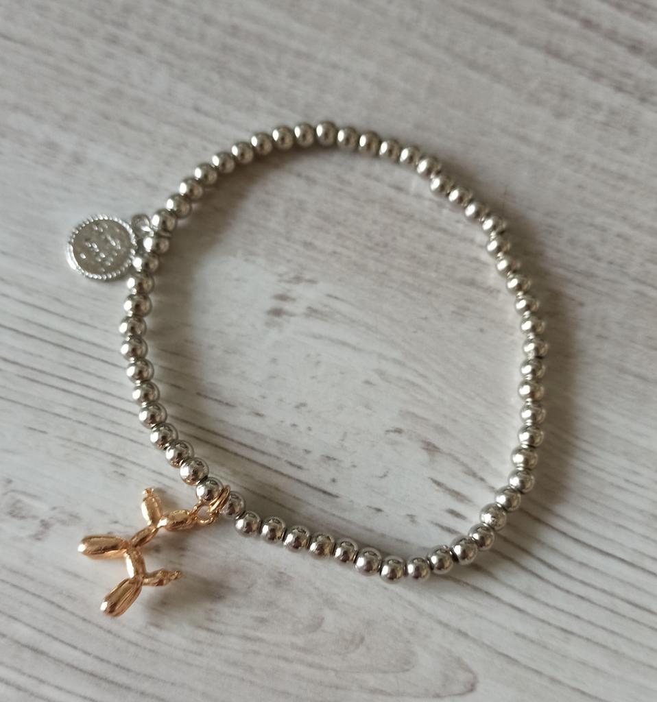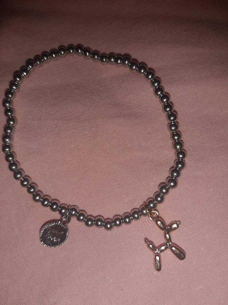 A bracelet with plastic beads on an elastic band, the dog seems to be metal. It looks good on the hand, but time will tell how long it will last.. On the very first day, the dog disappeared, got lost somewhere, and I didn't even notice.