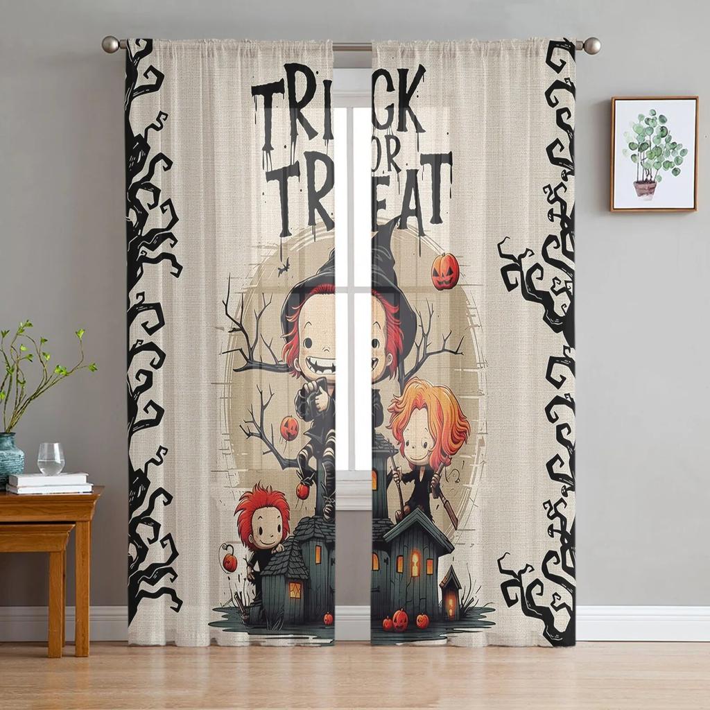 Halloween Pumpkin Branch Bedroom Transparent Sheer Curtains Holiday Decoration Window Voile Tulle Curtain