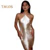 Features: This fashionable dress features a halter neck and waist-hugging design, with a T-shaped silhouette that flatters your figure. The laser-radiated oil glossy design adds a touch of character to the dress itself.