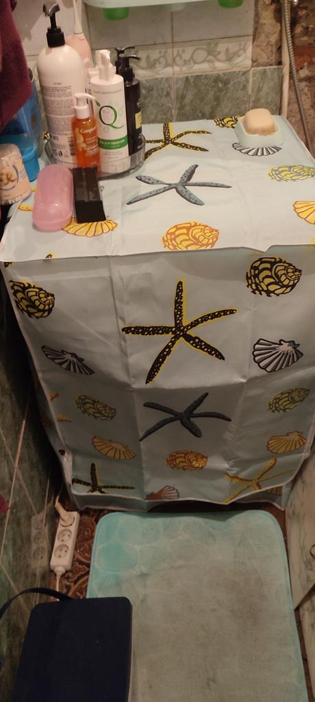 The waterproof washing machine cover comes in different colors, I chose the sea wave color with a seashell print, it goes well in my bathroom with the green tiles and the sea wave color framed mirror. The cover fit my machine, which is designed for a 5 kg load, I am satisfied.