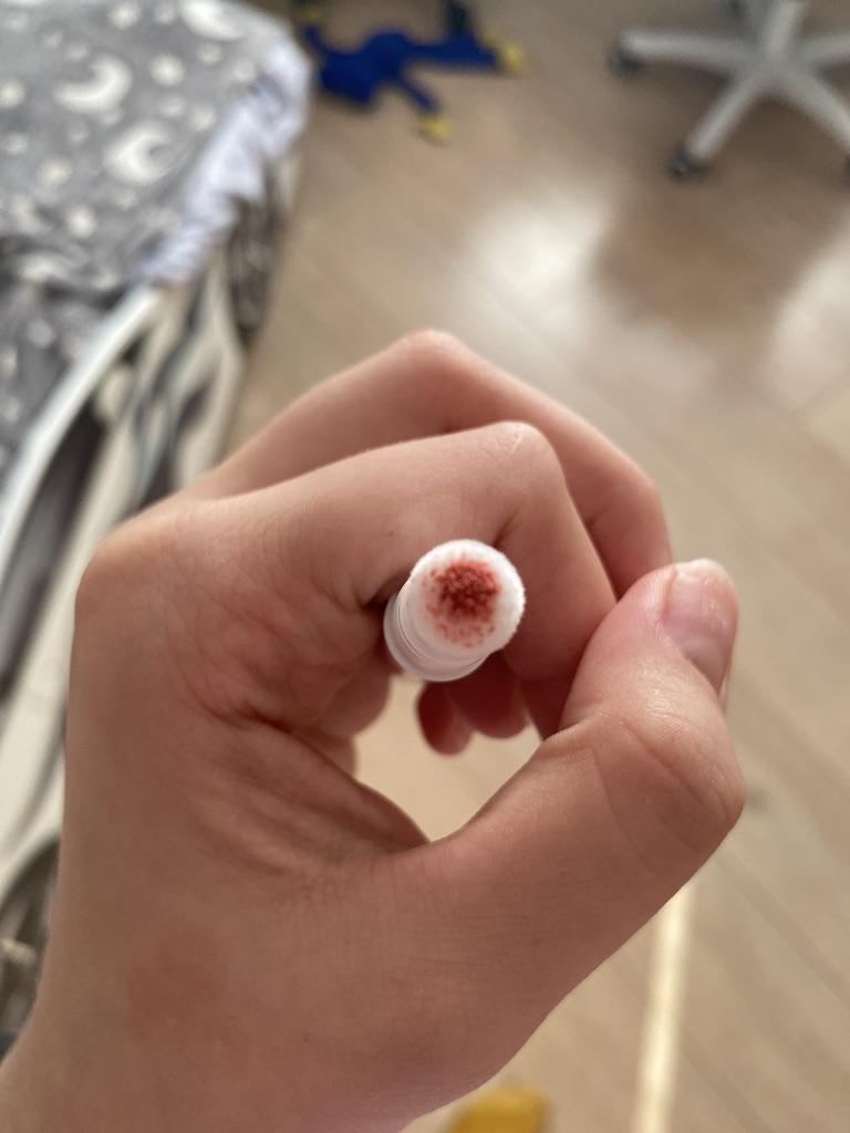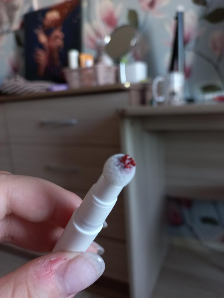 The lipstick is great. But that soft applicator quickly started to smell bad. So I took it off and applied the lipstick with a brush.