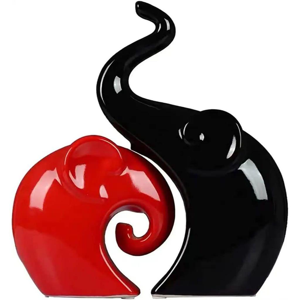 Home Decor Lucky Charm Elephant Couple | Piano Finish Ceramic Figures- (Set of 2 Piece, Red & Black)