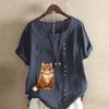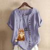 Women's Fashion Round Neck Short Sleeve T-shirt Casual Cotton Linen Graphic Shirt Leisure Loose Cute Cat Prined Summer Blouse Tops Plus Size