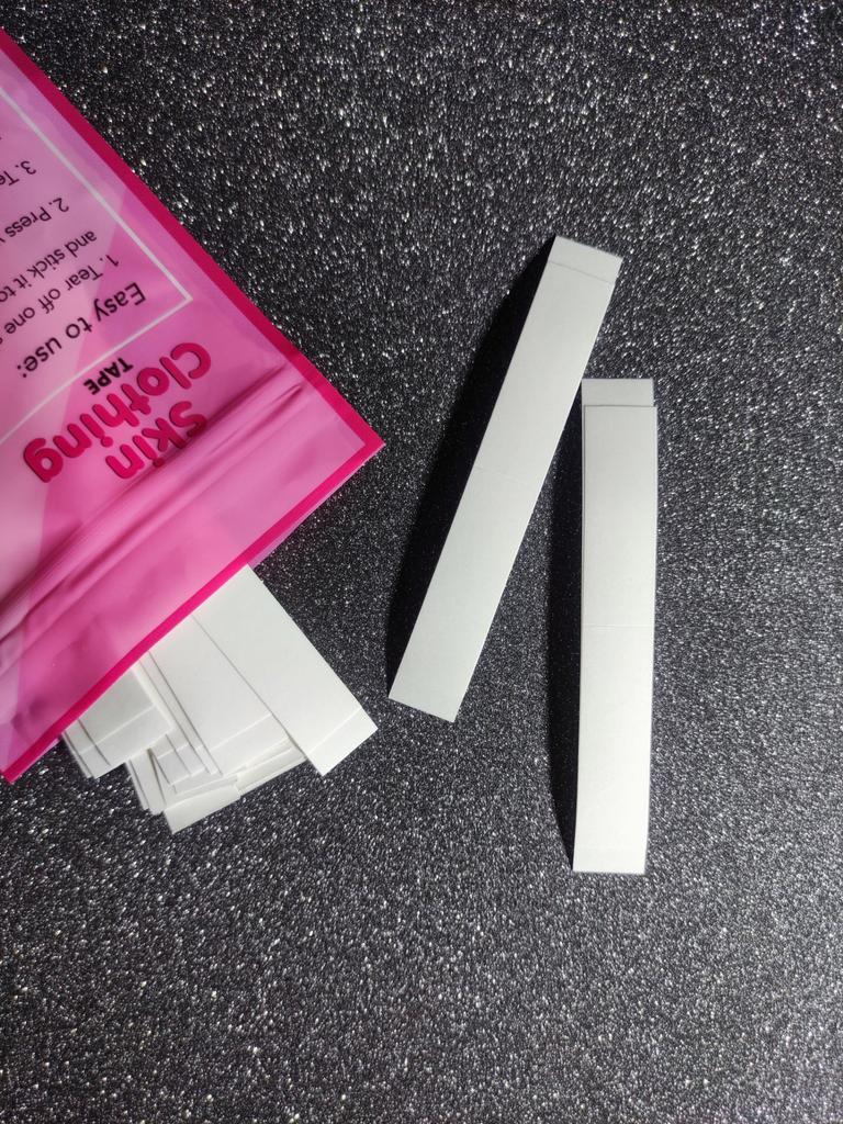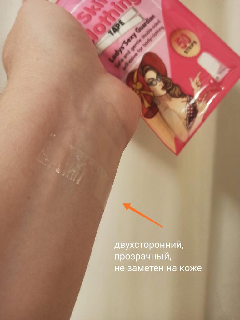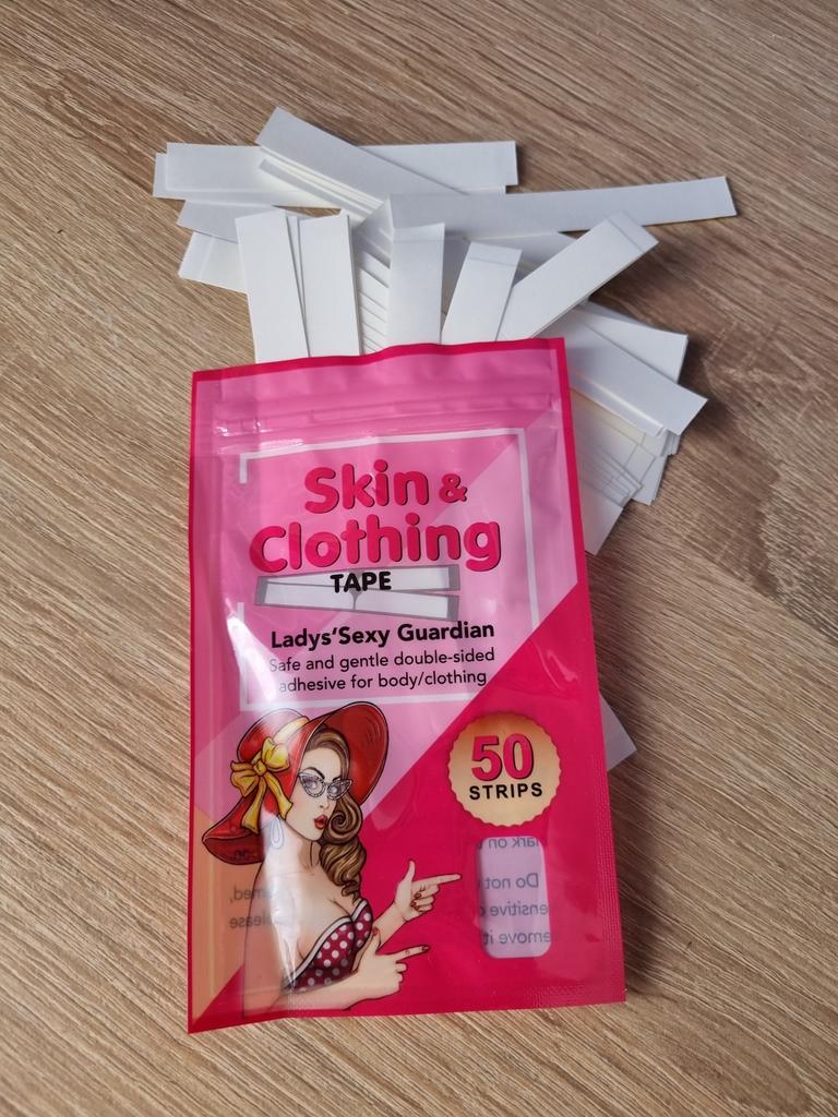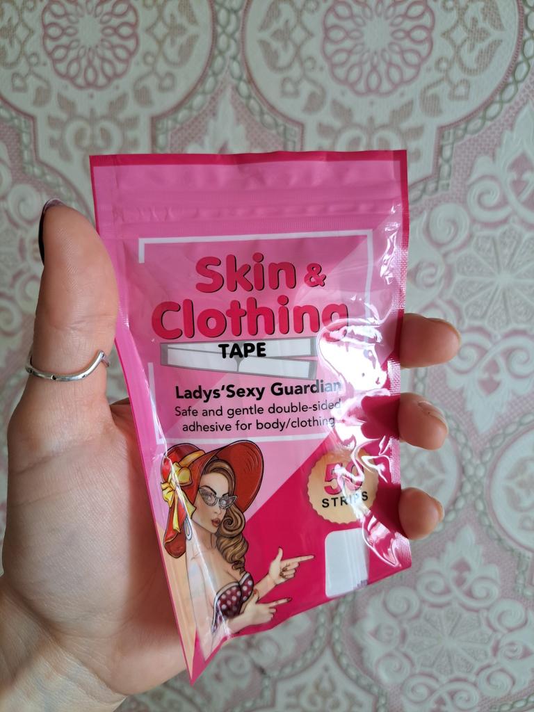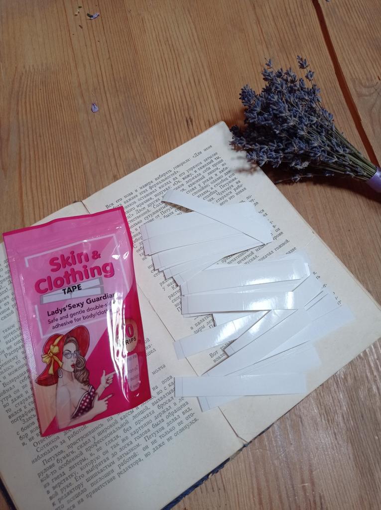 Adhesive strips for clothes 👗 An interesting idea that really works! I bought the strips for the summer, they are very convenient to use. They hold tightly, but do not irritate the skin and do not cause any discomfort.. I glued the strips to the skin, and then a strapless top to keep it on tightly.. 50 strips included. They come off clothes without any problems and leave no marks.