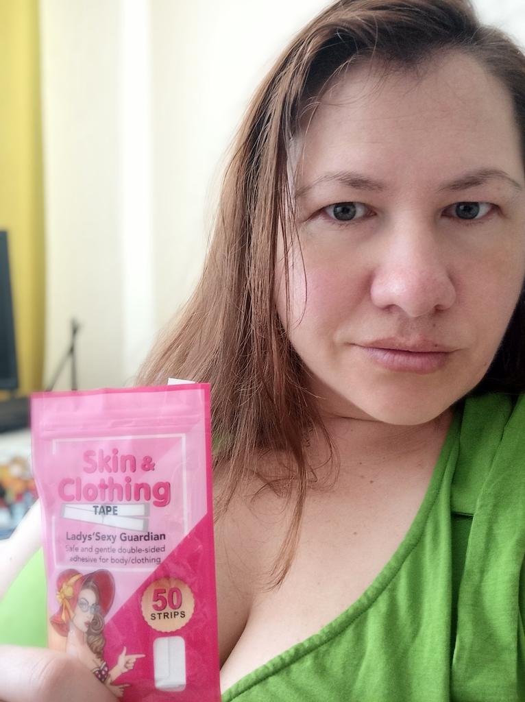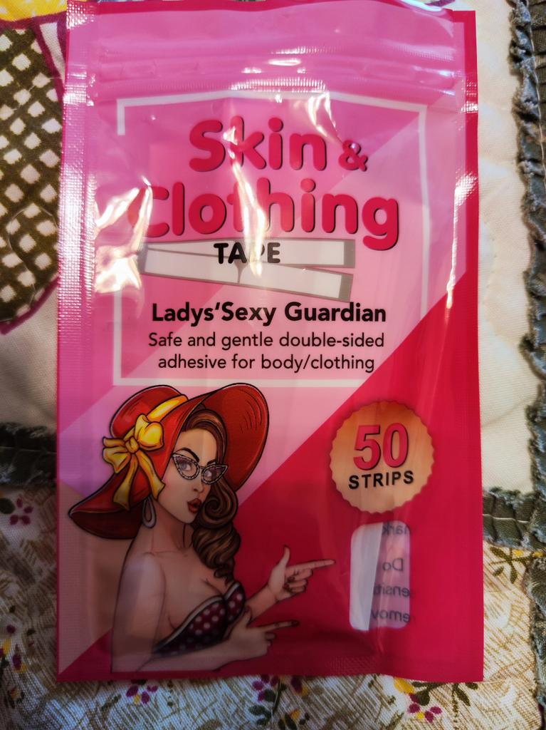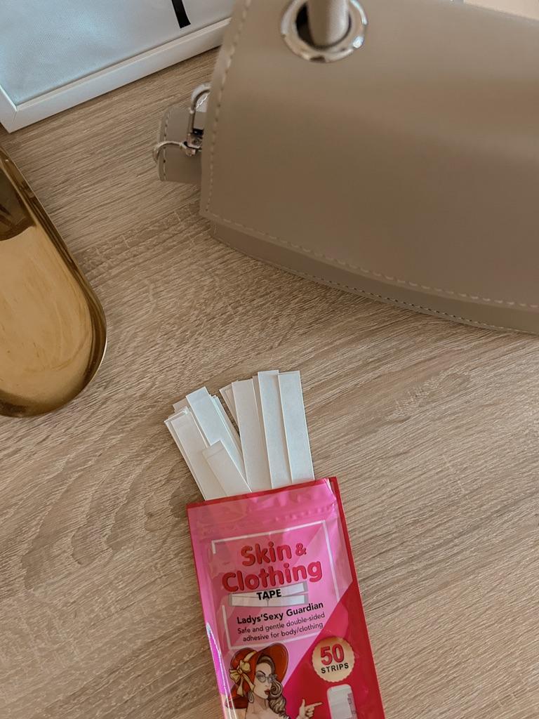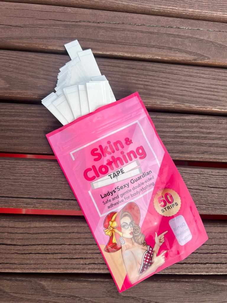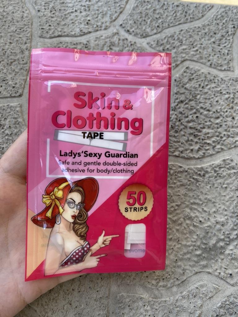 Adhesive strips for clothes 👗 An interesting idea that really works! I bought the strips for the summer, they are very convenient to use. They hold tightly, but do not irritate the skin and do not cause any discomfort.. I glued the strips to the skin, and then a strapless top to keep it on tightly.. 50 strips included. They come off clothes without any problems and leave no marks.