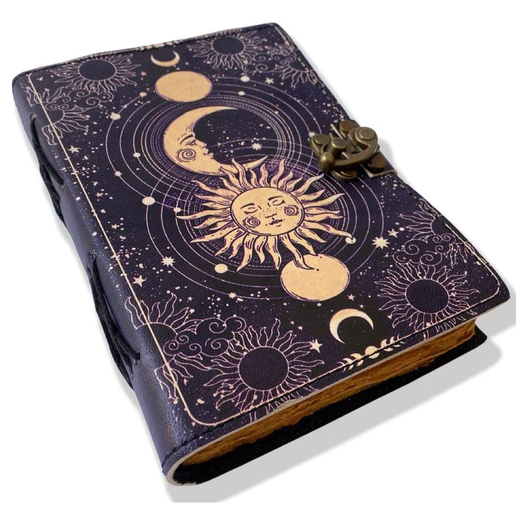 Celestial Sun & Moon Handmade Vintage Leather Journal Deckle Edge Paper, Blank Spell Book of Shadows Grimoire Journal, Gift for Him Her with 200 Pages